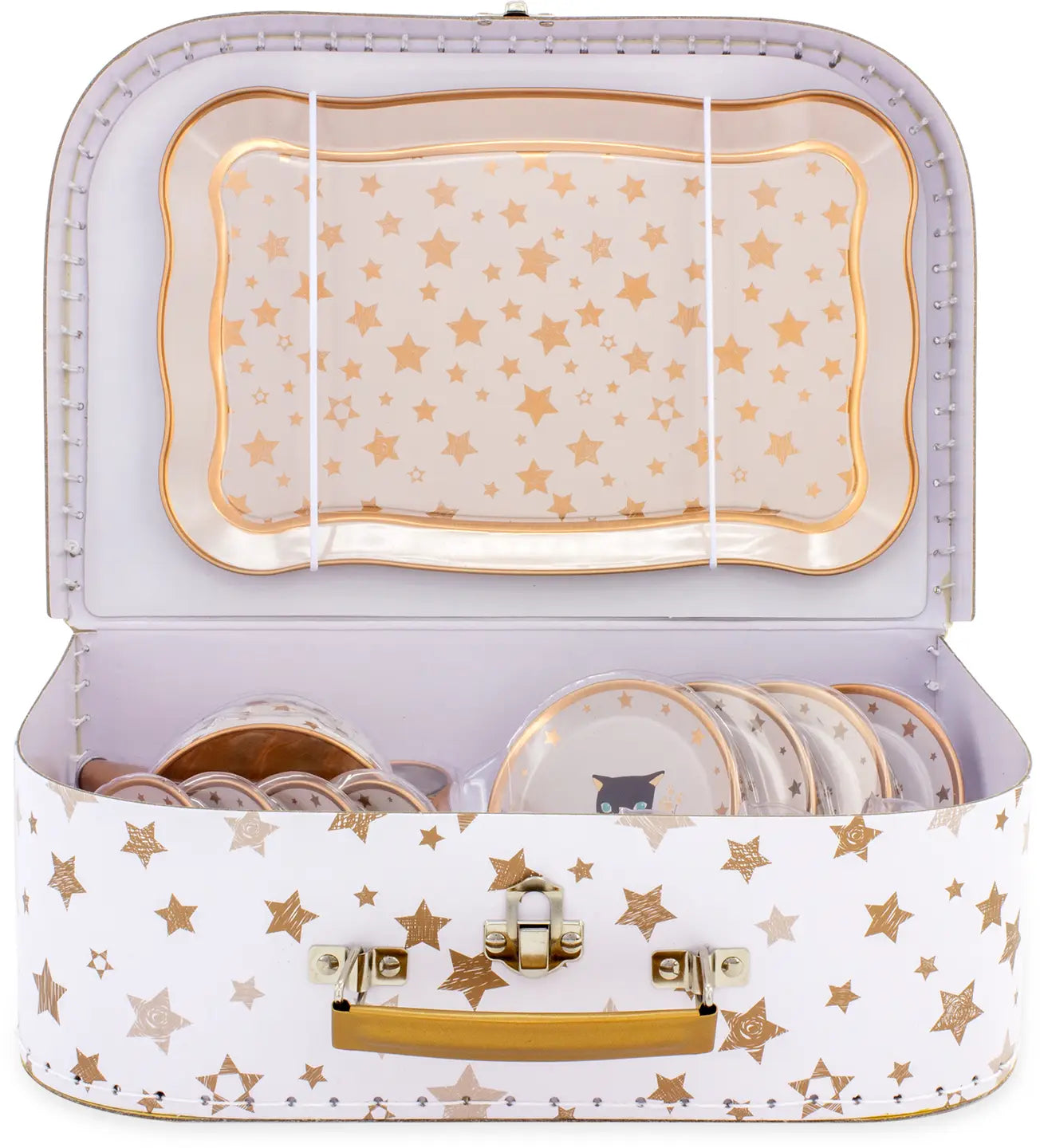 Rinkinyje yra visi būtini atributai mažajai šeimininkei: arbatinukas su dangteliu, elegantiškas padėklas, 4 lėkštelės, 4 puodeliai ir 4 lėkštutės. Tobula akimirkoms, kai vaikas prie stalo kviečia įsivaizduojamus draugus, žaislus ar pasakų veikėjus.