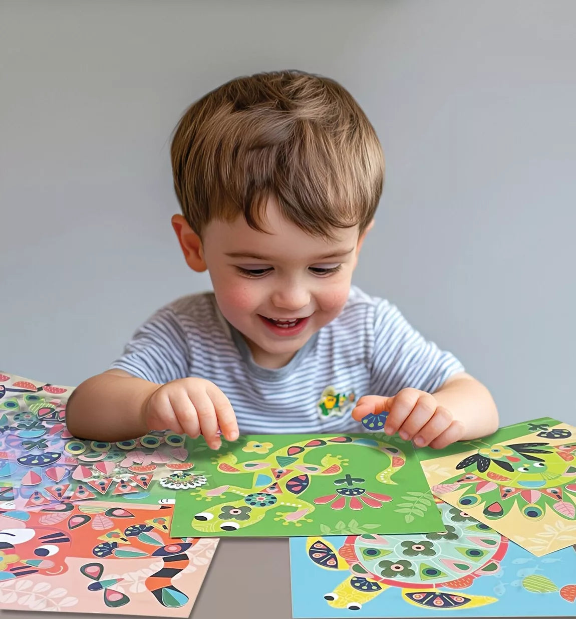 Vaikai gali kurti gražius spalvingų gyvūnų paveikslėlius naudodami daugkartinius lipdukus.