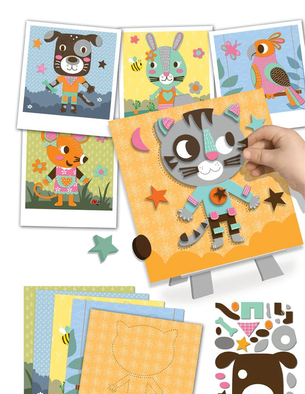 5 putplasčio lipdukų lapai, 5 kortelės su skirtingais gyvūnais, 1 molbertas ir žingsnis po žingsnio vadovas.
