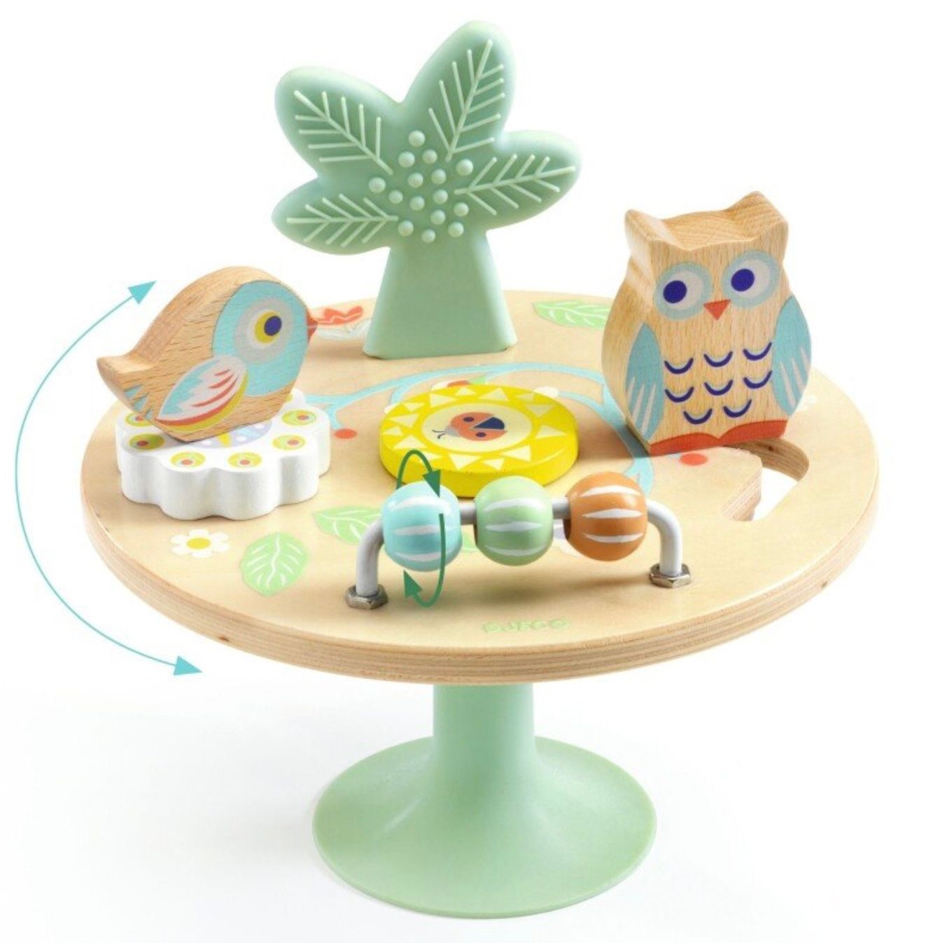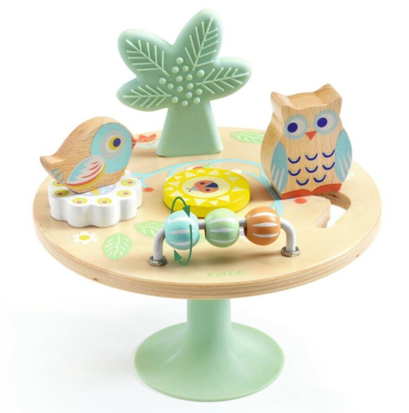Žaislas su siurbtuku ir 4 užduotimis: žaiskite su skaitliukais, pajudinkite paukštį, pasukite gėlę ir kramtykite palmę. Lenta sukasi, kad kiekviena užduotis būtų pasiekiama. Siurbtukas prilimpa prie bet kokio lygaus paviršiaus, todėl žaislas tampa lankstus ir saugus. Puikiai tinka rankų ir akių koordinavimui įgūdžiams. Dydis: 15 x 15 x 15 cm. Pagamintas iš medžio ir silikono. Rekomenduojamas amžius: nuo 12 mėnesių. Kilmės šalis: K.L.R. Pagaminta pagal Prancūzijos dizainą ir užsakymą.