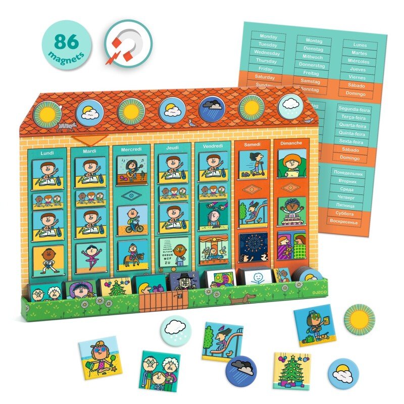 Mokomasis žaidimas, skirtas išmokti skaičiuoti laiką ir planuoti savaitės veiklą. Rinkinyje yra 1 milžiniška magnetinė namo lenta (41 x 30 cm), 85 įvairūs magnetai, lipdukų lapas su savaitės dienomis(papildomai pridėta lietuvių kalba) ir knygelė. Rekomenduojamas amžius: nuo 4 metų. Dėmesio! Netinka vaikams iki 3 metų, dėl smulkių detalių yra pavojus užspringti. Sudėtyje yra magnetukai. Juos prarijus, kreiptis pas gydytoją. Kilmės šalis: K.L.R.