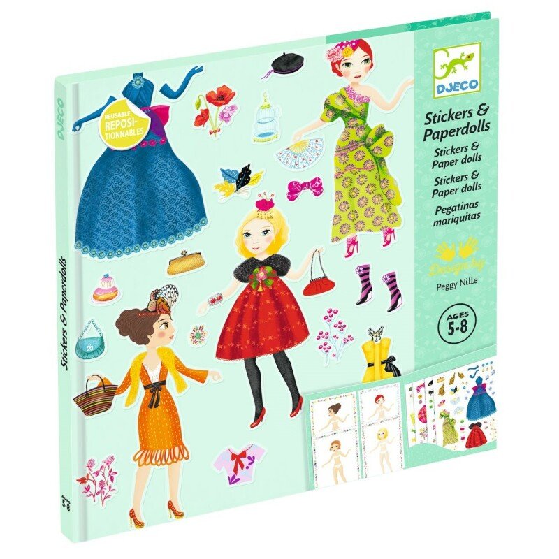 Kūrybinis rinkinys su daugkartiniais lipdukais. Dailus dėklas-kišenė su popierinėmis lėlėmis ir daugkartiniais lipdukais. 8 lėlės (9.5 x 14 cm) ir 4 lipdukų lapai. Rekomenduojamas amžius: nuo 5 iki 8 metų. Dėmesio! Netinka vaikams iki 3 metų, dėl smulkių detalių yra pavojus užspringti. Kilmės šalis: K.L.R. Pagaminta pagal Prancūzijos dizainą ir užsakymą.