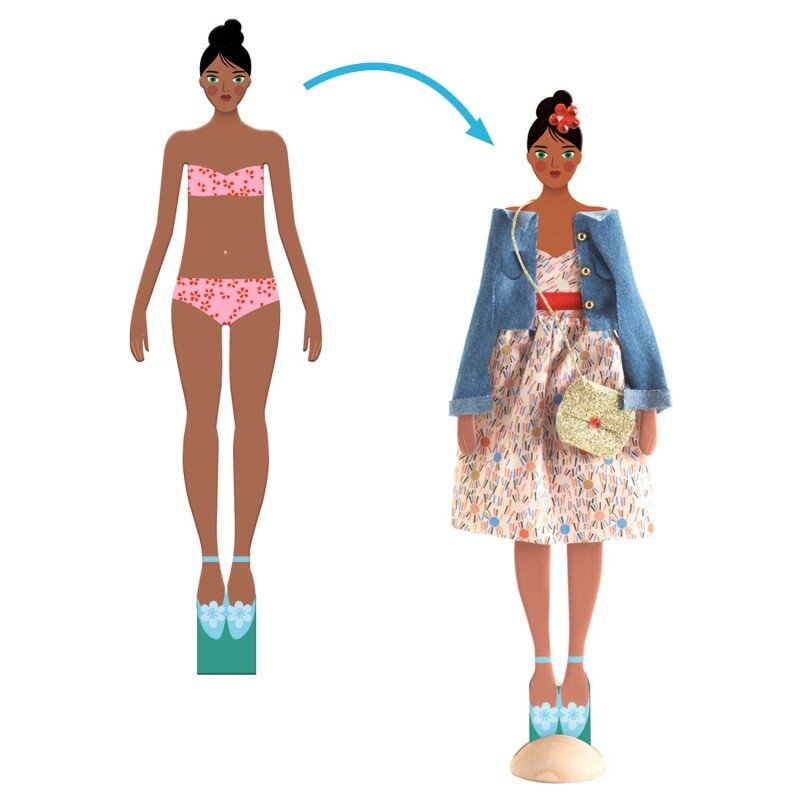 Vadovaudamiesi instrukcijomis, iš tikro audinio iškirpkite ir pagaminkite įvairius stilingus drabužius. Rinkinyje yra 3 lėlės (25 cm) su 3 mediniais pagrindais, 8 įvairių spalvų ir medžiagų audiniai, 2 juostelės, 2 elastinės virvelės, karoliukai ir maži aksesuarai, žirklės, dvipusė juosta, rašiklis ir 3 lapai su iškarpomis. Rekomenduojamas amžius: nuo 7 iki 12 metų. Dėmesio! Netinka vaikams iki 3 metų, dėl smulkių detalių yra pavojus užspringti. Kilmės šalis: K.L.R.