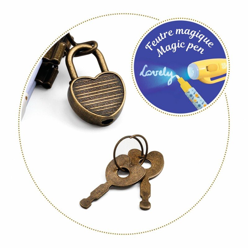 Magijos paslapčių užrašinė linijomis su spyna, 2 raktais ir stebuklingu rašikliu su fluorescenciniu efektu. Magiškas rašiklis yra su nematomu rašalu, kuris atsiranda apšvietus UV spinduliais (paslėpta dangtyje). Rašiklis veikia su 3 LR44 baterijomis (yra komplekte). Rekomenduojamas amžius: nuo 8 metų. Dėmesio! Tai ne žaislas! Netinka vaikams iki 3 metų, dėl smulkių detalių yra pavojus užspringti. Kilmės šalis: K.L.R. Pagaminta pagal Prancūzijos dizainą ir užsakymą.