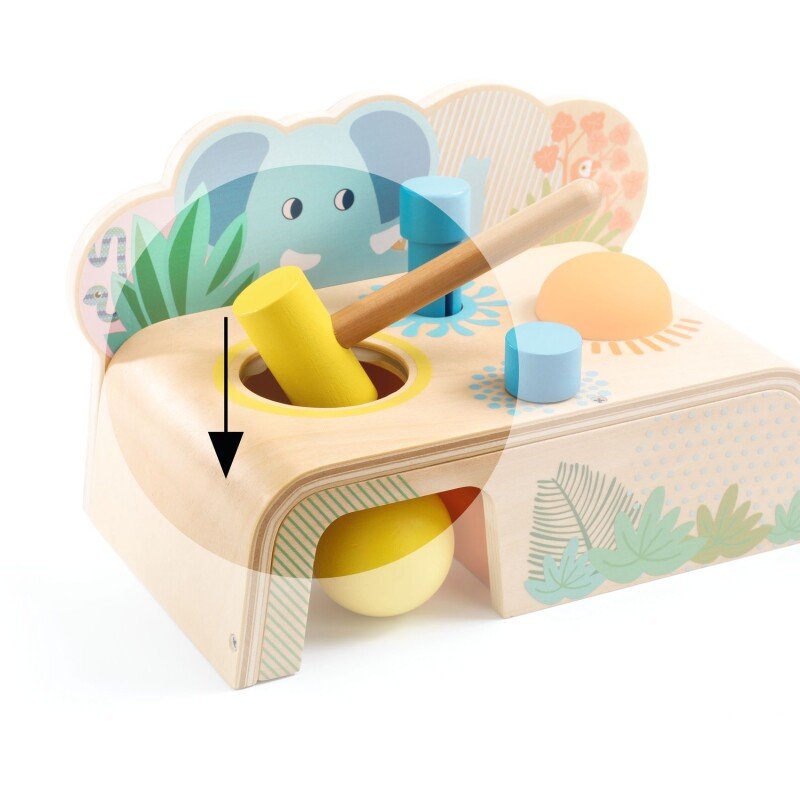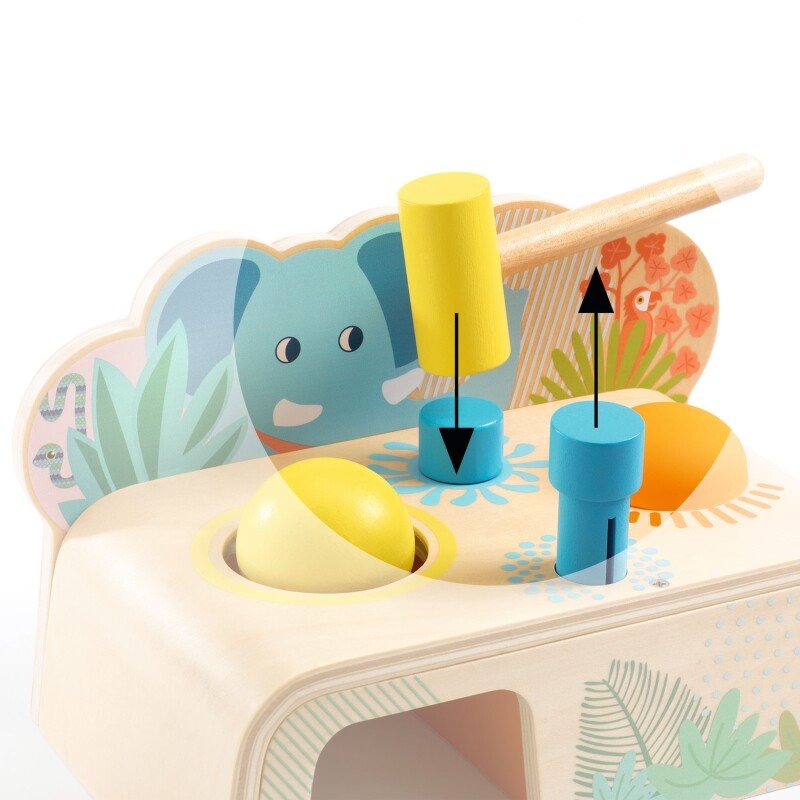 Šis žaidimas puikiai lavina smulkiąją motoriką, rankų–akių koordinaciją, padeda pažinti formas, spalvas ir priežasties–pasekmės ryšį. Tvirta medinė konstrukcija ir ergonomiškas plaktukas pritaikyti mažoms rankytėms.