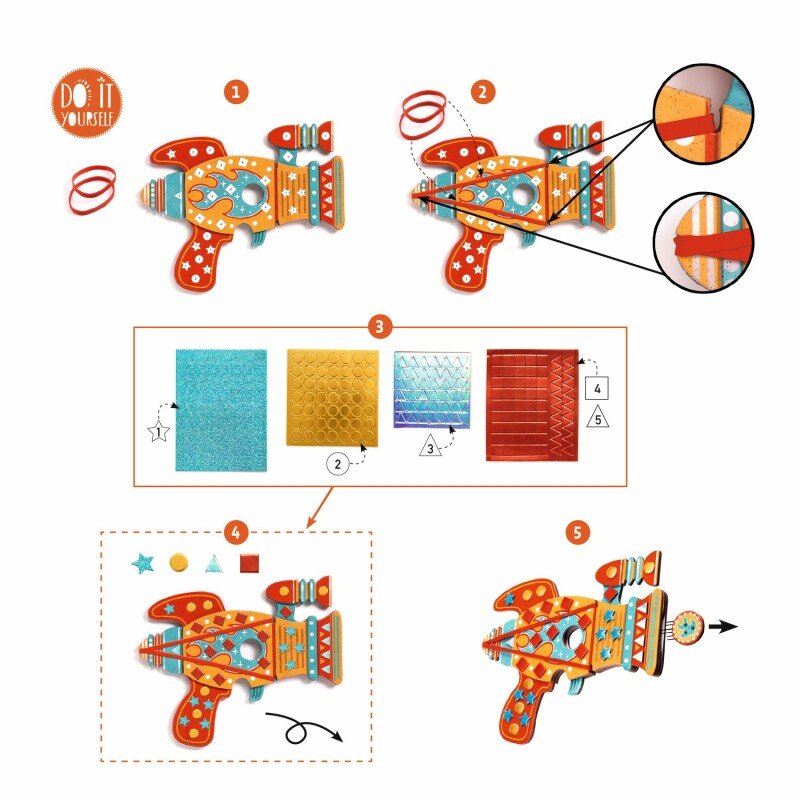 Kūrybinis rinkinys, skirtas papuošti mozaikiniais lipdukais tris žetonų paleidikliai. Apklijavę visus tris, galėsite juos panaudoti žetonams paleisti ir užkariauti galaktiką! Rinkinyje yra 3 storo kartono paleidikliai, 15 žetonų, 6 guminės juostelės, 4 metalizuotų minkštų mozaikinių lipdukų lapai ir išsami instrukcija. Rekomenduojamas amžius: nuo 5 metų. Dėmesio! Netinka vaikams iki 3 metų, dėl smulkių detalių yra pavojus užspringti. Kilmės šalis: K.L.R. Pagaminta pagal Prancūzijos dizainą ir užsakymą.