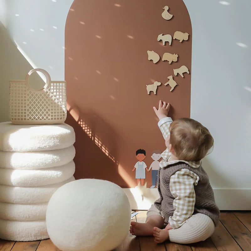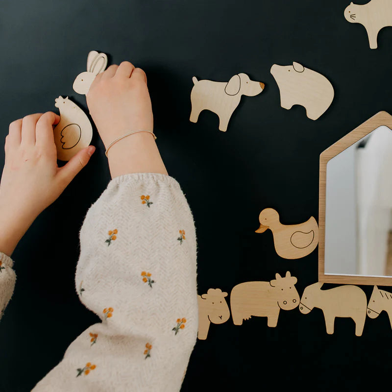 - 11 klevo medienos magnetukų*, pagamintų iš atsakingai ir tvariai tvarkomų miškų: triušis, šuo, arklys, višta, asilas, antis, ožka, avis, karvė, katė, kiaulė.