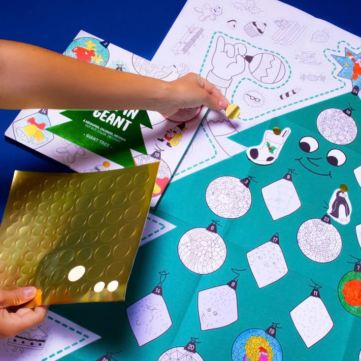 Milžiniškas Kalėdų eglutės plakatas, kurį galima nuspalvinti, papuošti ir iškirpti... pridedamas lipdukų lapas su papuošimais, kad būtų dar smagiau.
