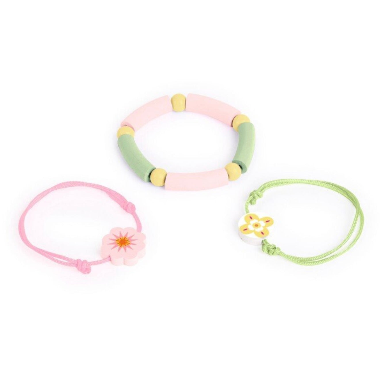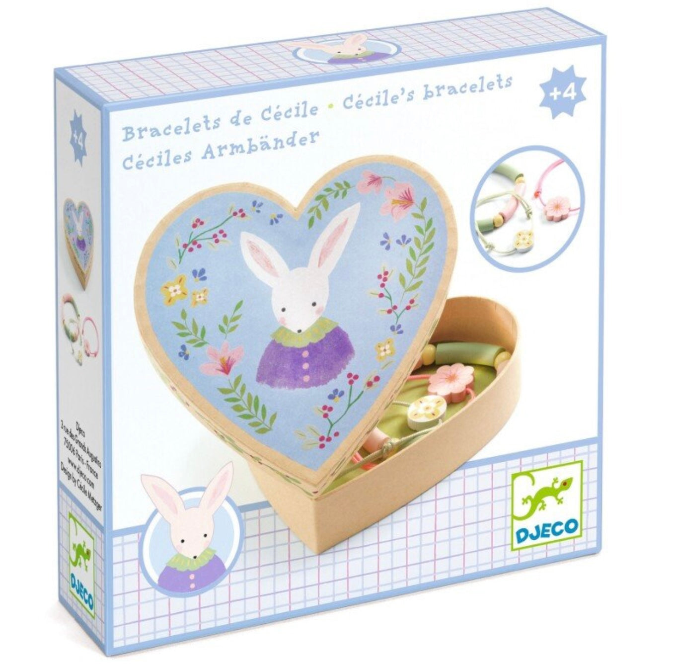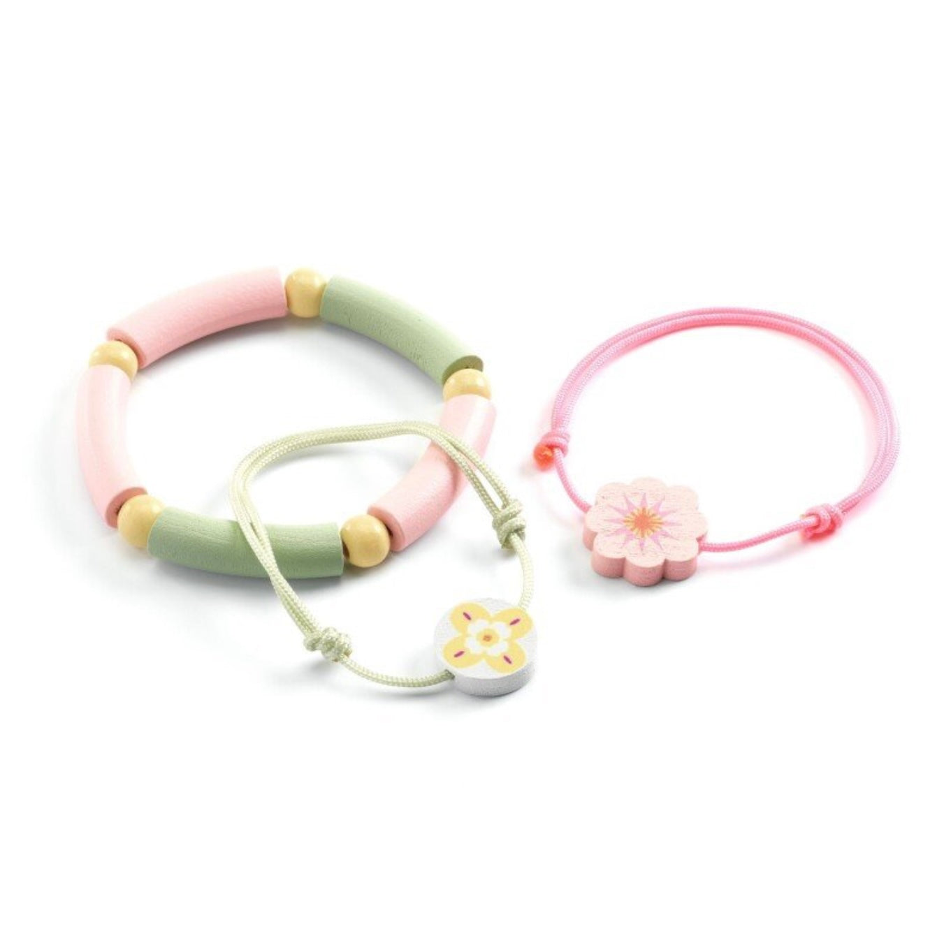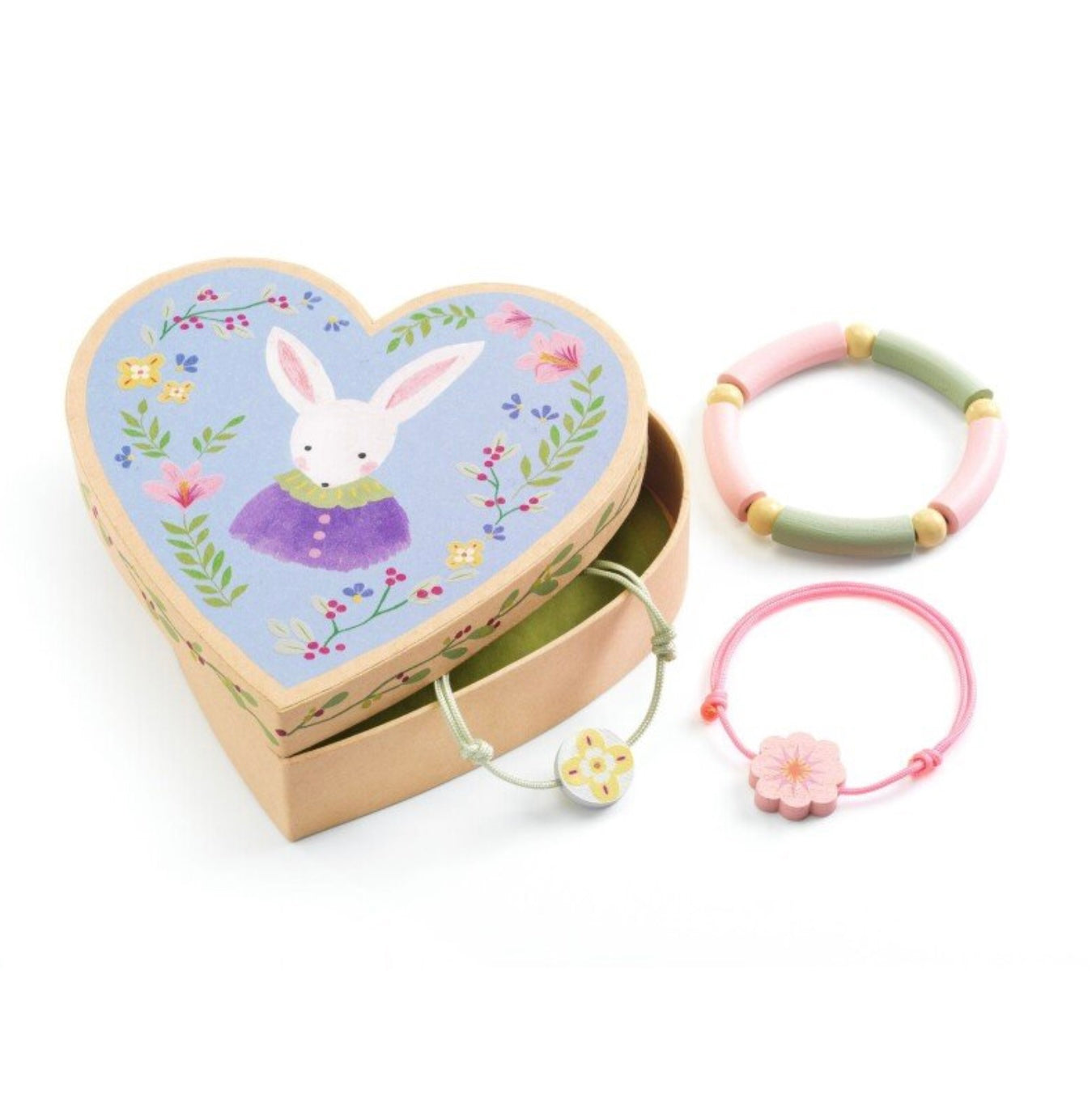 Šis rinkinys skirtas ne kūrimui, o žaidimui ir pasipuošimui – komplekte rasite 3 jau pagamintas apyrankes su mediniais karoliukais, tvarkingai sudėtas į iliustruotą širdelės formos dėžutę.