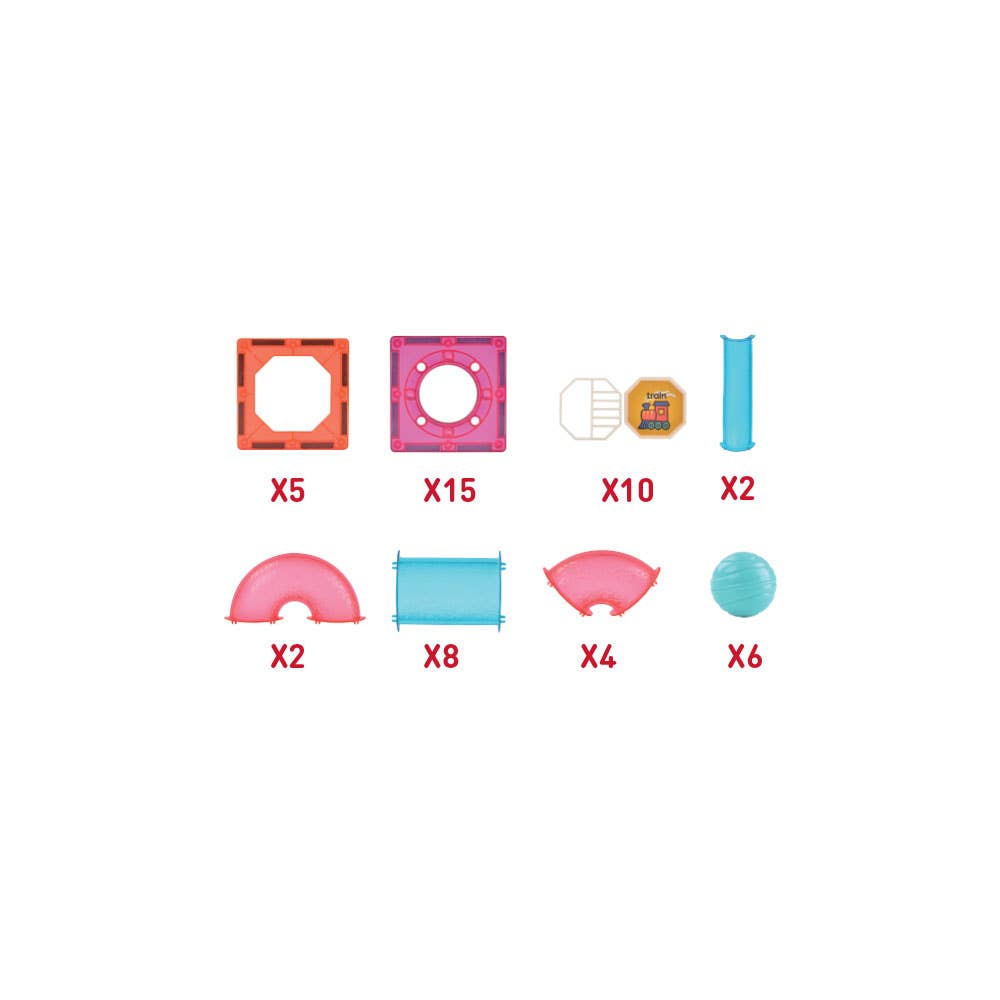 Rinkinyje yra spalvotos 7,5 cm poliarizuotos magnetinės 3D formos, vamzdeliai ir kamuoliukai, leidžiantys vaikams kurti neribotas jungtis ir labirintų konstrukcijas.