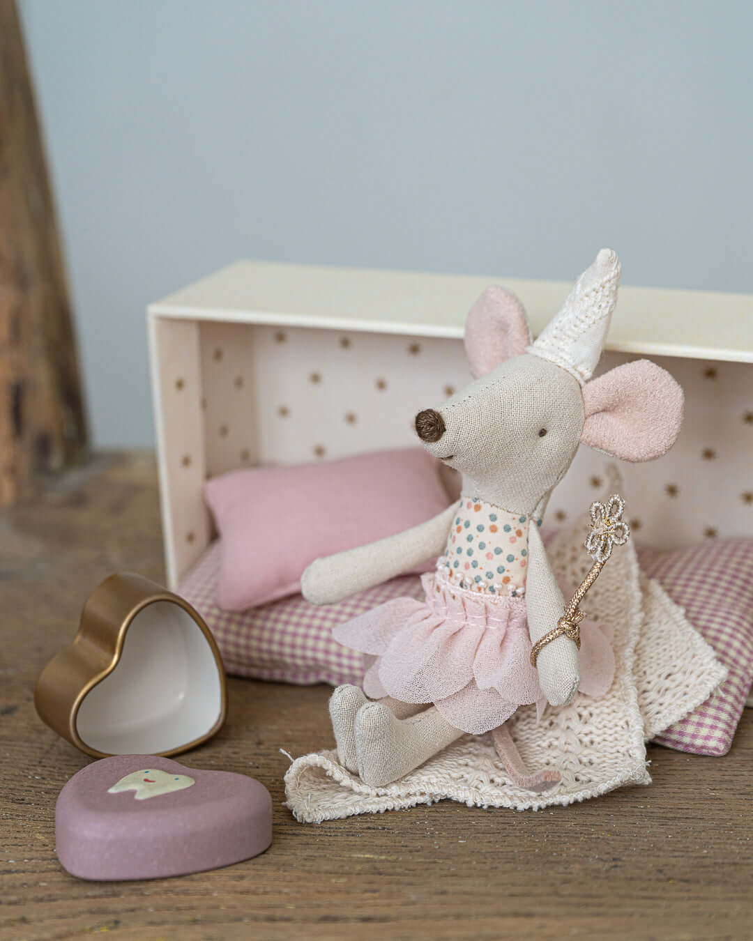 Maileg Dantukų fėja pelytė – tai žavingas ir magiškas žaislas, kuris pradžiugins kiekvieną vaiką. Mažoji pelė apsirengusi mielais fėjos drabužėliais, kepurėlę, bei turi dėžutę dantukams ir yra paguldyta į klasikinę „degtukų dėžutės“ tipo lovytę – kaip tikra pasakų fėja!