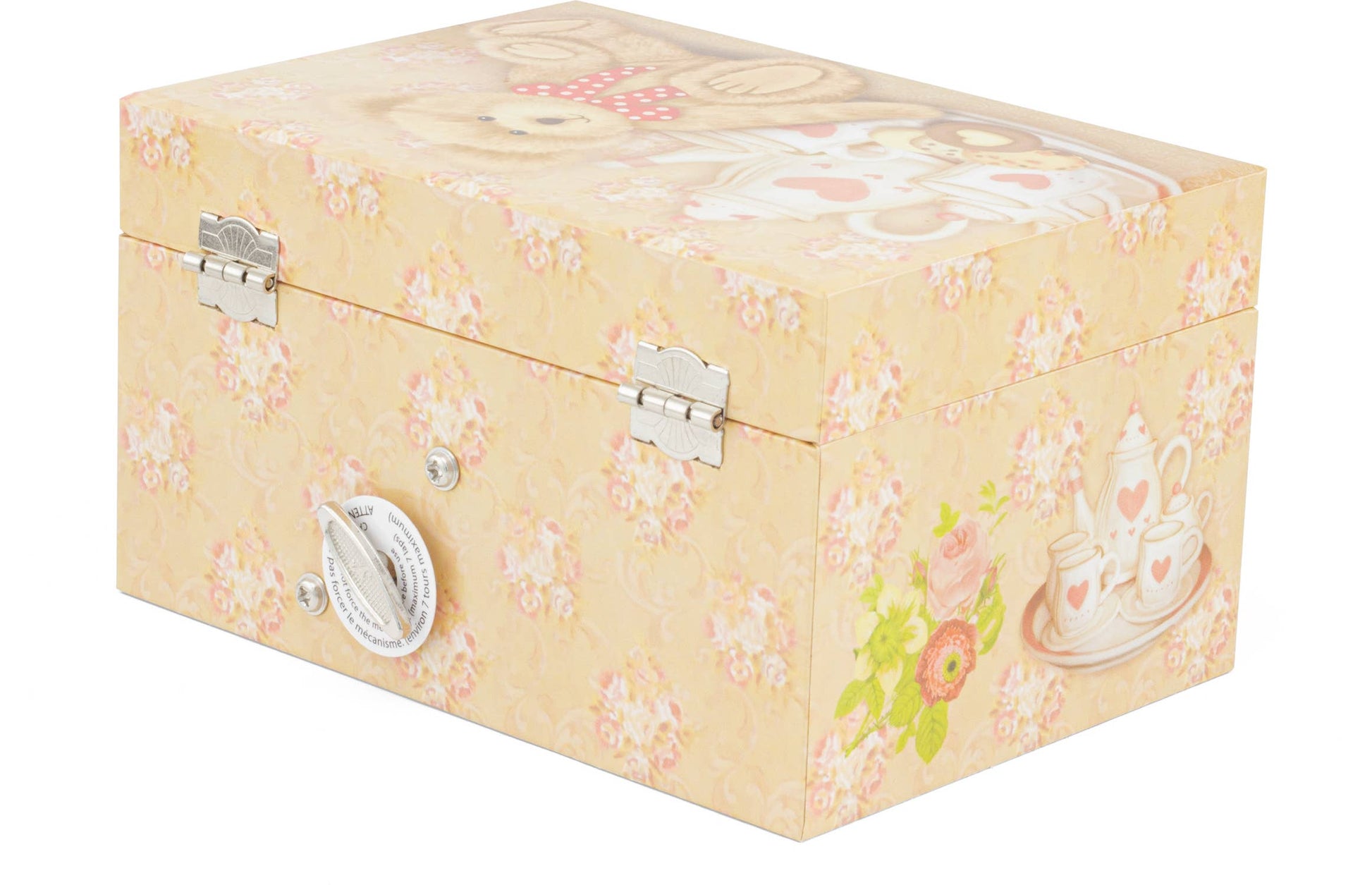 Muzikos mechanizmo raktelis yra dėžutės gale – pasukus jį, aktyvuojama melodija.
