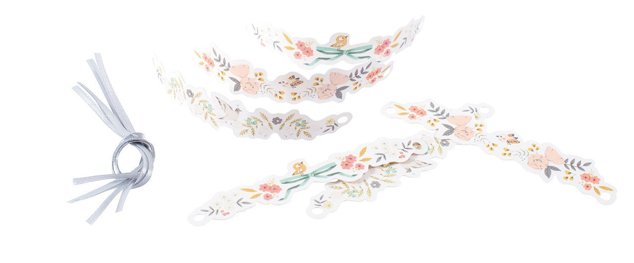 Papuoštos gėlėmis ir paukščiais, šios žavios kortelės-apyrankės užrišamos prie jų pritvirtintomis medžiaginėmis juostelėmis.