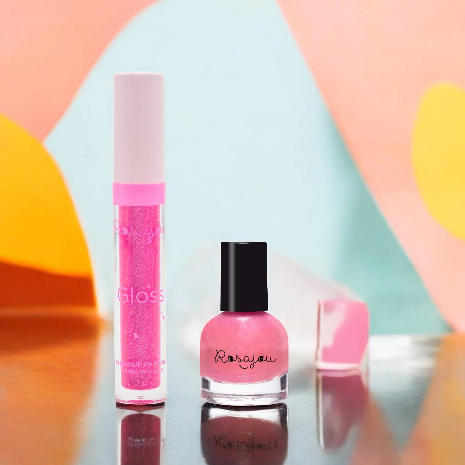 Veganiškų lūpų blizgio ir nagų lako „RUBIS“ duetas. Spalvotoms lūpoms ir priderintiems nagams: kas gali būti prašmatniau! Veganiška formulė. Skirta vaikams. Dermatologiškai patikrinta. Pagaminta Prancūzijoje. Blizgesys: 5,5 ml. Nagų lako buteliukas: 5 ml.