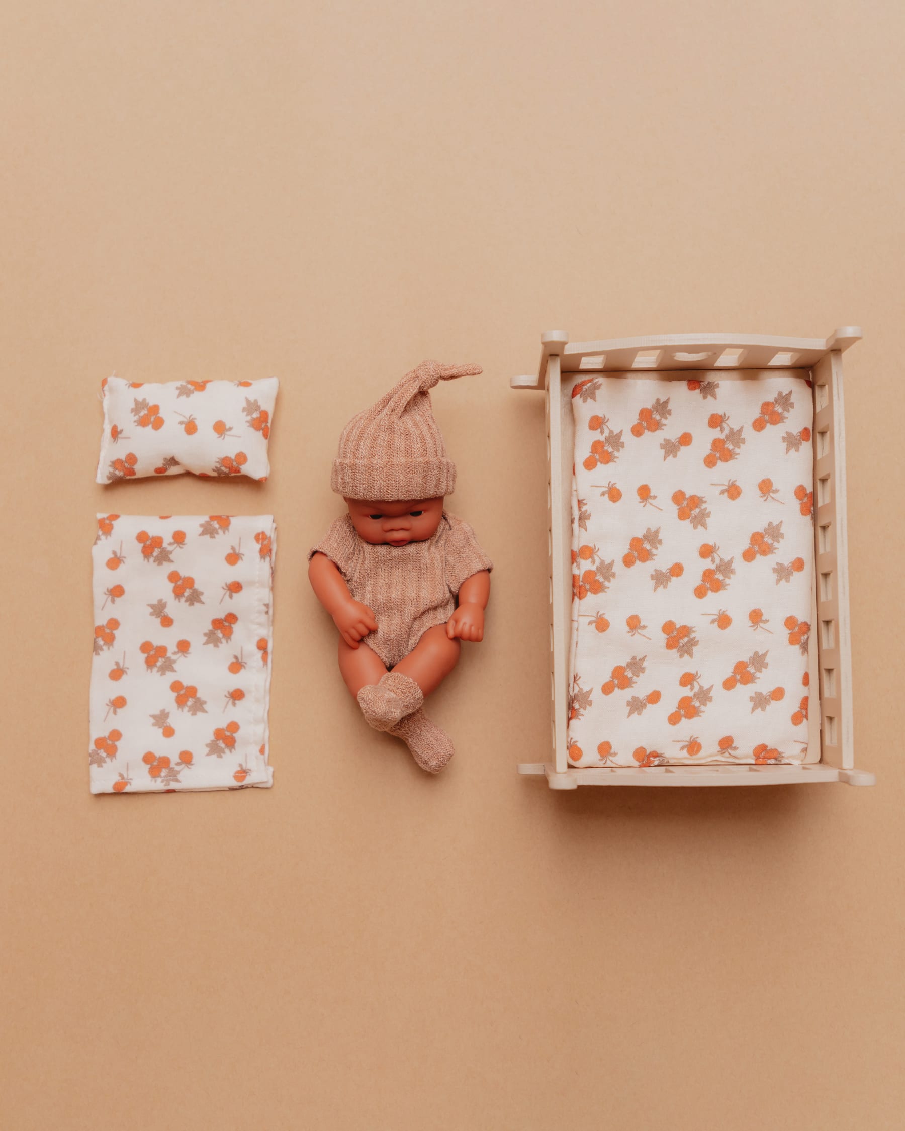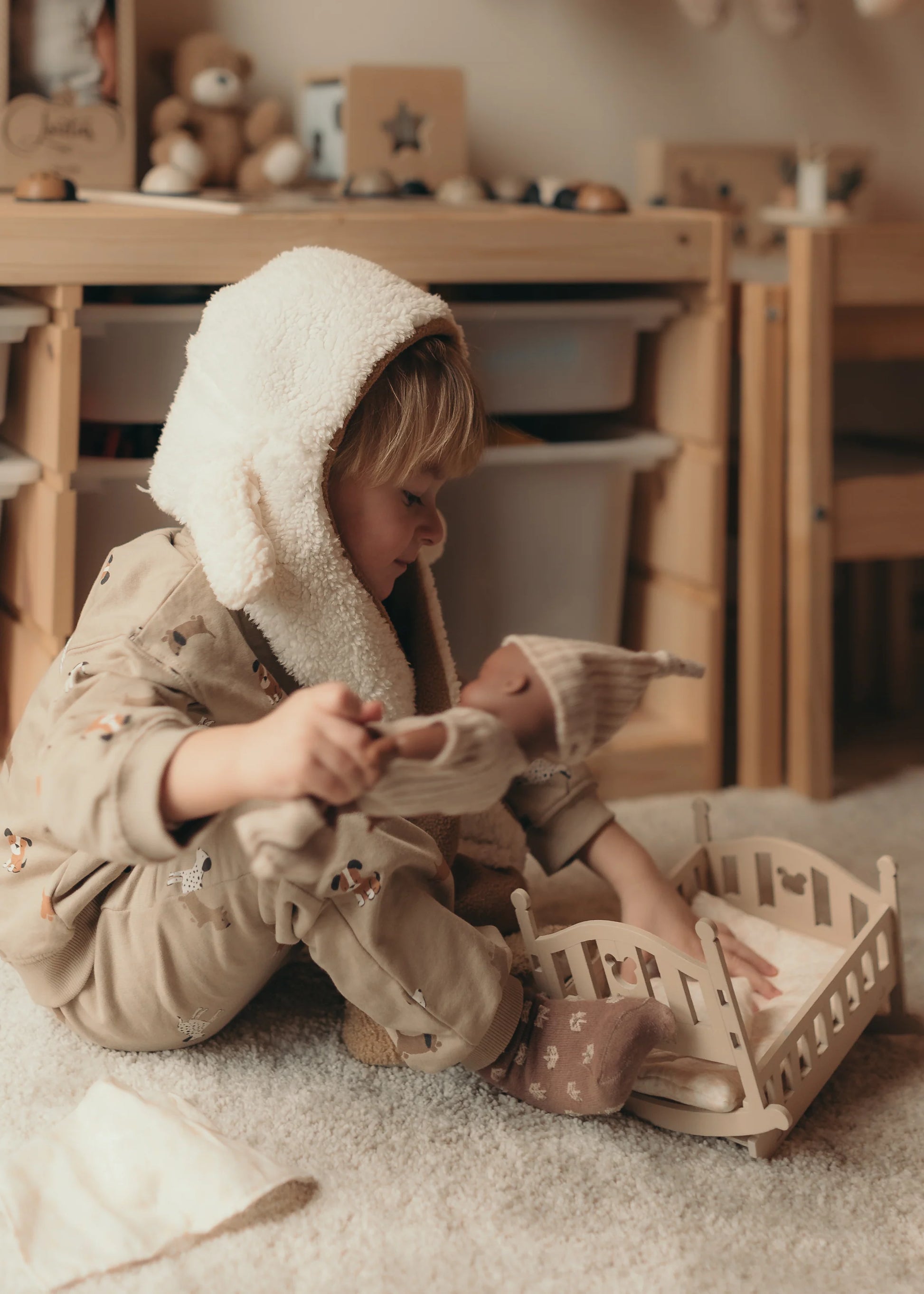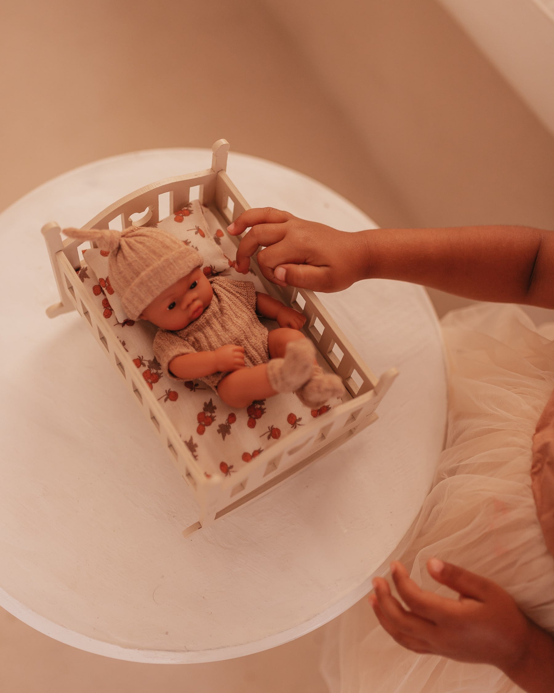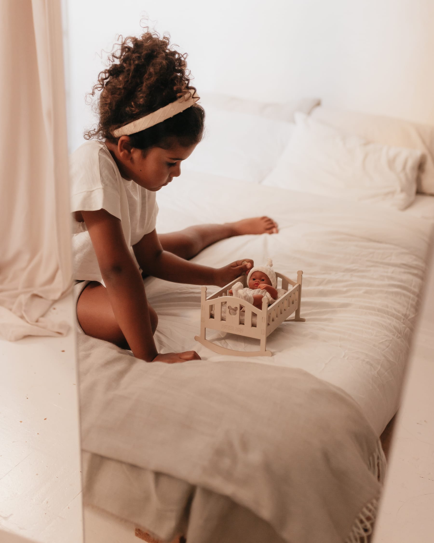 „Lupita“ rinkinį papildo rankų darbo medinė supamoji lovelė ir minkšti patalėliai – čiužinys, pagalvėlė ir paklodė. Kartu jie sukuria jaukią erdvę svajonėms, poilsiui ir žaidimams, lavinantiems vaikų vaizduotę ir emocinį ryšį.
